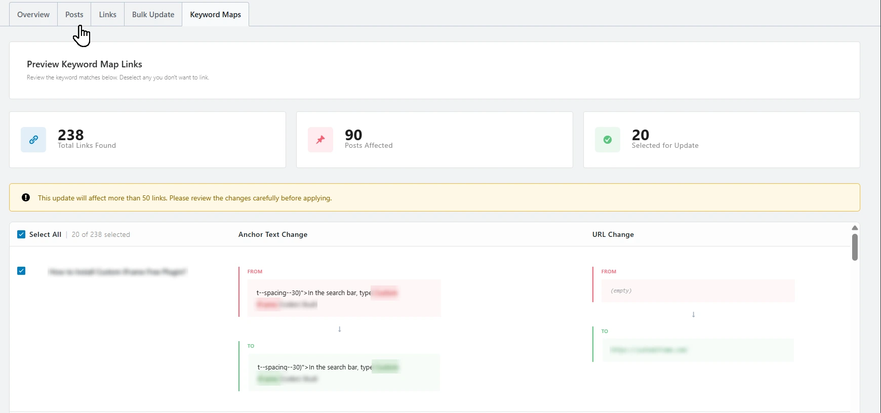 The Bulk Link Update Tool makes it manageable. You can update target URLs, anchor text, and link attributes across hundreds of posts at once. Before anything changes, you get a full preview of what will be affected. And if something goes wrong after applying, you can roll it back safely.